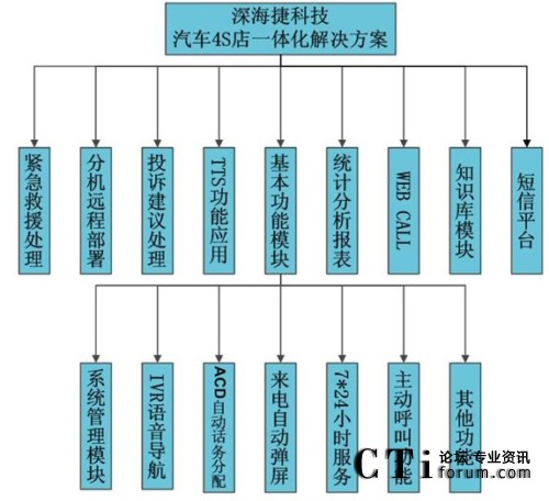 針對(duì)目前國(guó)內(nèi)汽車4S店的服務(wù)現(xiàn)狀,并結(jié)合4S店需求的獨(dú)特特點(diǎn),專為國(guó)內(nèi)汽車4S店量身打造的深海捷汽車4S店聯(lián)絡(luò)中心系統(tǒng),除具備呼叫中心基本功能外,還集成了分機(jī)遠(yuǎn)程部署、TTS功能、緊急救援處理模塊、投訴/建議受理模塊、WEB CALL模塊和短信平臺(tái)模塊等特色功能?傮w功能結(jié)構(gòu)圖如下: