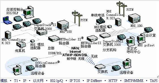 使用標準多協(xié)議路由器,諸如3Com PathBuilder或NET Builder II路由器,您能夠通過廣域網(wǎng)或Internet將多個分支機構(gòu)與您的總部系統(tǒng)相連接。您可以隨意選擇網(wǎng)絡: 支持工業(yè)標準Internet協(xié)議(IP)聯(lián)網(wǎng)的DSL、電纜、幀中繼或ISDN。您甚至能夠通過使用3Com NBX ConneXtions H.323網(wǎng)關(guān)應用,來充分利用低成本、高質(zhì)量的IP語音 (VoIP) H.323服務。因為NBX ConneXtion使用Internet作為長途線路上本地到本地的撥號路徑,因此它能夠以極低的成本提供傳統(tǒng)電話專用線路和后端分機(OPX)線路的優(yōu)勢。