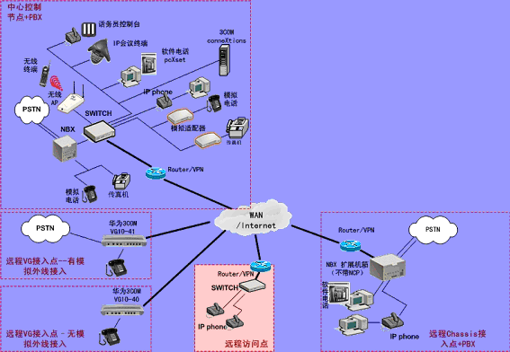 遠端使用 HuaWei-3COM 的 VG 語音網關接入 PSTN 。