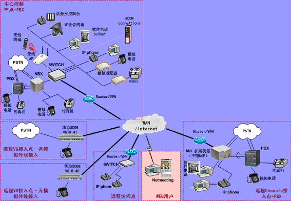 ②.統(tǒng)一的分支機構電話平臺,可以支持任何數(shù)據(jù)骨干網(WAN)技術,包括DDN、幀中繼、VPN、xDSL等。3COM NBX 系統(tǒng)也可以在無線局域網上運行。