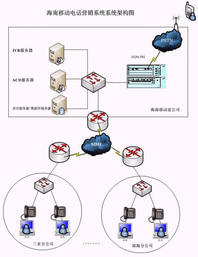 此次為電話營銷系統(tǒng)一期工程,在省公司部署一套NBX V5000系統(tǒng)及相應(yīng)的CTI服務(wù)器,通過2條E1接入PSTN,在18個地市直接部署50個IP電話終端及坐席端軟件,語音走移動已有的MDCN網(wǎng)絡(luò),一個集中受理分布處理的呼叫中心系統(tǒng)就建設(shè)起來啦,本次工程從設(shè)備到貨、系統(tǒng)上線試運行,僅僅用了1個星期,我們海南移動公司的項目經(jīng)理都驚訝的說"太快啦啦,要是使用傳統(tǒng)的排隊機(jī)部署一個分布全省的類似系統(tǒng),少說工期也得幾個月"。經(jīng)過1個月的試運行,系統(tǒng)運行穩(wěn)定,各項系統(tǒng)指標(biāo)滿足合同要求,在11月份系統(tǒng)順利通過初驗。