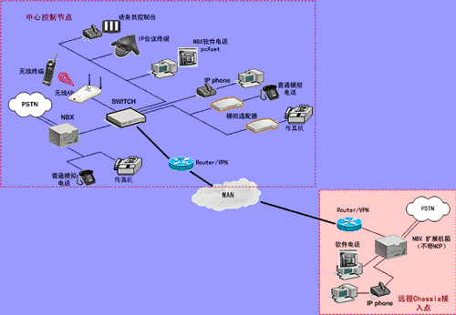 遠(yuǎn)端也可以有單獨的 IP 話機(不需要 NBX 呼叫處理器)接入系統(tǒng)。