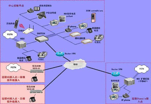 ③.遠(yuǎn)程接入的辦公室不再需要專用的 PBX, 只需要將3Com NBX電話終端接入到WAN網(wǎng)中,就能地實現(xiàn)在WAN或Internet上與3Com