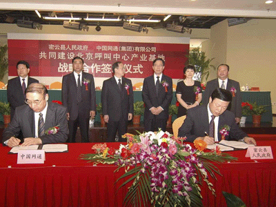 簽約儀式在密云瑞海姆田園度假村舉行,雙方就共建北京呼叫中心產(chǎn)業(yè)基地項(xiàng)目簽訂了《共同建設(shè)北京呼叫中心產(chǎn)業(yè)基地戰(zhàn)略合作協(xié)議》,北京市副市長(zhǎng)茍仲文同志、中國(guó)網(wǎng)通(集團(tuán))有限公司董事長(zhǎng)兼總裁左迅生、副總裁姜正新,北京市發(fā)展改革委、規(guī)劃委等市政府相關(guān)部門(mén)、密云縣人民政府、中國(guó)網(wǎng)通(集團(tuán))有限公司以及多家新聞媒體共計(jì)100余人參加了儀式。