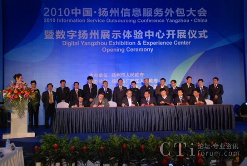CTI論壇(ctiforum)4月22日消息(記者 潘婷婷):4月21日上午,由揚(yáng)州市人民政府主辦、揚(yáng)州市廣陵區(qū)人民政府及揚(yáng)州市經(jīng)濟(jì)和信息委員會(huì)承辦、中國國際投資促進(jìn)會(huì)支持的“2010中國·揚(yáng)州信息服務(wù)外包大會(huì)暨數(shù)字揚(yáng)州展示體驗(yàn)中心開展儀式”在名為“中國聲谷”的江蘇信息服務(wù)產(chǎn)業(yè)基地(揚(yáng)州)召開。