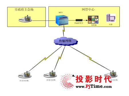 傳輸網(wǎng)絡(luò)采用4M專線,整個(gè)系統(tǒng)由控制中心、市政府主會場和18個(gè)區(qū)縣分會場組成,在控制中心配置MCU、網(wǎng)管和電視墻多畫面顯示單元,通過網(wǎng)管對系統(tǒng)實(shí)行設(shè)備的統(tǒng)一管理和會議資源的統(tǒng)一調(diào)度,控制中心配置18路電視墻集中顯示單元,通過電視墻,可實(shí)時(shí)監(jiān)看18個(gè)區(qū)縣分會場情況。在市政府主會場和18個(gè)區(qū)縣分會場,各會場配置1套高清晰視頻會議終端,各會場終端4M專線接入控制中心,實(shí)現(xiàn)全市電子政府的視頻會議系統(tǒng)。系統(tǒng)建設(shè)完成后,可實(shí)現(xiàn)導(dǎo)演控制、主席控制、點(diǎn)名發(fā)言、會場輪巡、攝像機(jī)遠(yuǎn)控、電視墻、多畫面、多方混音等視頻會議系統(tǒng)功能。
