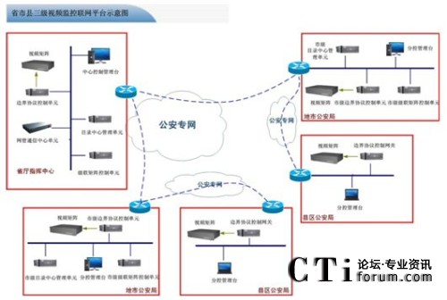 在省廳到地市之間配置視頻監(jiān)控聯(lián)網(wǎng)平臺中的核心管理調(diào)度單元、專用視頻終端、CS中心GIS控制客戶終端、邊界標準協(xié)議控制單元,地市核心管理調(diào)度單元、級聯(lián)矩陣控制中心單元、網(wǎng)管通信中心單元、中心音頻ACU調(diào)度單元、邊界標準協(xié)議控制網(wǎng)關(guān)、CS中心GIS控制客戶終端、通用型數(shù)字矩陣解碼陣列、通用標準控制矩陣鍵盤等組件構(gòu)建省至地市級公安監(jiān)控聯(lián)網(wǎng)系統(tǒng)。