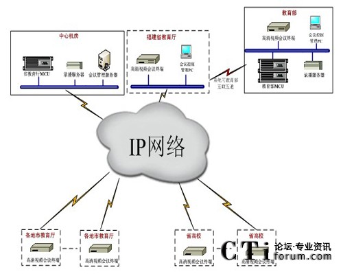 根據(jù)福建省教育廳的招標文件要求,以及用戶對于視頻會議的具體要求,MCU采用了迪威公司的FOCUS8600系列,會議錄播系統(tǒng)采用FOCUS1800,終端采用迪威高清會議終端FOCUS3800,攝像機采用迪威的DVC-HD1,同時考慮系統(tǒng)的擴展能力和兼容能力,即可構(gòu)建本地96個點的高清會議,同時能夠與教育部MCU實現(xiàn)互聯(lián)互通,實現(xiàn)會議的多級級聯(lián),能同步顯示教育部MCU發(fā)送的高清多分屏畫面和雙流畫面。