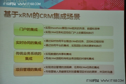 而基于xRM的CRM集成則包括門(mén)戶的集成、實(shí)時(shí)協(xié)同的集成、傳統(tǒng)業(yè)務(wù)系統(tǒng)的集成和項(xiàng)目管理的集成。