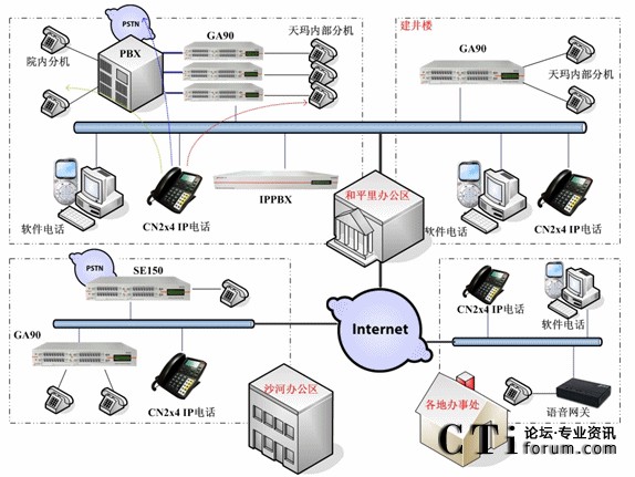 具體情況是:和平里的總部與沙河辦公區(qū)之間為網(wǎng)絡專線,并有公網(wǎng)出口。各辦事處使用ADSL撥號上網(wǎng)方式。總部的方案設計中,使用了5臺GA90網(wǎng)關,兩臺IPPBX以及多部IP話機和軟件電話。和平里辦公區(qū)工位數(shù)量為120左右,其中多數(shù)工位需要部署模擬話機,個別工位屬于非固定的移動工位,需要部署CN2x4