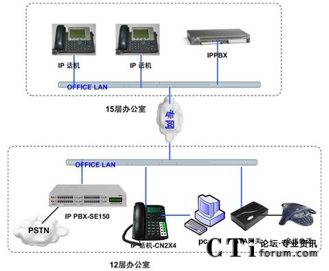 隨著企業(yè)規(guī)模的不斷擴(kuò)展,公司在15層新增約50人的辦公區(qū),需要和12層實現(xiàn)內(nèi)部通訊免費(直撥分機(jī)號碼),出局路由沿用現(xiàn)有ISDN線路,F(xiàn)有的傳統(tǒng)的集團(tuán)電話設(shè)備已經(jīng)滿配,無法適應(yīng)企業(yè)規(guī)模的擴(kuò)張,無法跨地域組網(wǎng),不能建立多點分布式的內(nèi)部電話系統(tǒng),不能充分利用現(xiàn)有的IP網(wǎng)絡(luò)資源發(fā)展有助于提高企業(yè)競爭力的網(wǎng)絡(luò)增值業(yè)務(wù)。