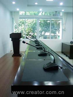 所以在本會議室配置了1臺標準的會議討論型控制主機臺CR-M4101,1臺座式的主席機CR-M4102B,9臺座式的會議代表機CR-M4104B,另外還有連接電纜等。主席機具優(yōu)先控制權,設置主席位置,并且可以移動,代表機分別設置其余數(shù)個話筒點。采用手拉手方式,一條總線即可連接所有會議討論設備,布線簡單快捷。通過專業(yè)的音頻輸出口和音響擴聲系統(tǒng)結(jié)合,清晰、明亮的將發(fā)言人的聲音重放出來。
