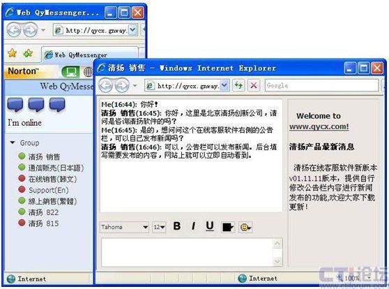 Web即時(shí)通信,對(duì)任意地方的客戶(hù),是用IE即可以訪問(wèn)"對(duì)話"。所以,它虛擬出一個(gè)銷(xiāo)售人員的接觸途徑。