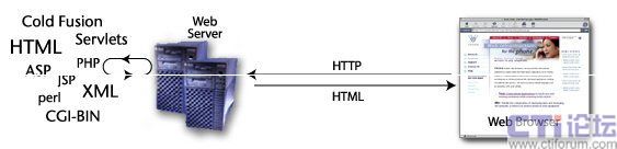 在互聯(lián)網(wǎng)上,瀏覽器通過Internet協(xié)議――比如HTTP――向Web服務器發(fā)出請求,而Web服務器上存放著靜態(tài)頁面和動態(tài)應用,它們將把HTML返回給瀏覽器,最終結(jié)果在瀏覽器中展現(xiàn)出來。如下圖所示: