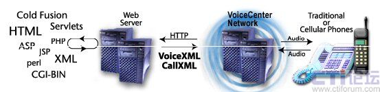 類似地,在Voxeo網(wǎng)絡上,語音應用遵從與標準Web頁面相同的瀏覽器模型。所不同的是,不是采用HTML,而是使用電話標記語言(VoiceXML、CCXML或CallXML)來編寫頁面。經(jīng)過Voxeo VoiceCenter網(wǎng)絡的處理,這些頁面將把語音返回給呼叫方。如下圖所示: