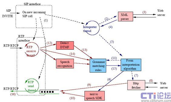 1. 當(dāng)瀏覽器接收到一個新進來的SIP呼叫后,它創(chuàng)建三個不同線程:RTP接收線程、RTP發(fā)送線程和VoiceXML解釋器線程。RTP接收線程從主叫方接收媒體數(shù)據(jù)包并調(diào)用DTMF檢測模塊;RTP發(fā)送線程將媒體數(shù)據(jù)包以流的方式發(fā)送給主叫方。一個單獨的發(fā)送線程幫助維護外出數(shù)據(jù)報的固定帶寬(比如針對G.711音頻的64