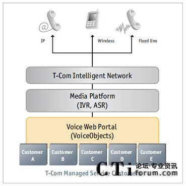 T-Com轉(zhuǎn)向VoiceObjects尋求一個(gè)可以管理成百上千應(yīng)用的解決方案,確保對(duì)客戶(hù)的高可用性和可靠性,并且?guī)椭3脂F(xiàn)有和未來(lái)的開(kāi)發(fā)和更改成本在一個(gè)低水平上。在2004年初,T-Com引入了語(yǔ)音Web門(mén)戶(hù),一個(gè)發(fā)揮了Web基礎(chǔ)架構(gòu)和立足于VoiceObjects服務(wù)器網(wǎng)絡(luò)版本的語(yǔ)音應(yīng)用服務(wù)平臺(tái)!拔覀冋趯ふ也粌H能幫助我們開(kāi)發(fā),而且可以維護(hù)和管理我們的自服式電話(huà)應(yīng)用的解決方案,”Klindworth說(shuō):“當(dāng)時(shí)真的還沒(méi)有電話(huà)應(yīng)用服務(wù)器公司目錄,但這正是我們需要的:該產(chǎn)品是服務(wù)執(zhí)行平臺(tái),并且以Web應(yīng)用服務(wù)器的方式工作。我們發(fā)現(xiàn)它就是VoiceObjects。”
