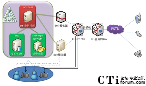 Office Communications Server 使用SIP 協(xié)議連接到PHILIPS Is3030交換機(jī)。然后通過微軟演示中的PBX再連接到本地的PSTN.
