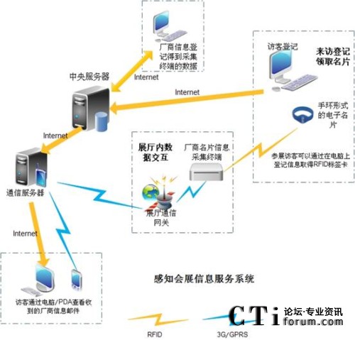 SEISS的基本部件:基于RFID技術制作的參展/巡展電子名片,帶3G/GPRS(也可使用WIFI等其他的傳輸方式)的感應收發(fā)裝置,參展企業(yè)的電腦客戶端服務軟件,會展文件服務器。