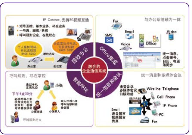 諾基亞西門子通信綜合企業(yè)通信平臺(tái),針對(duì)網(wǎng)絡(luò)未來發(fā)展及企業(yè)用戶對(duì)下一代語音和融合多媒體業(yè)務(wù)的需求,提出了專業(yè)的企業(yè)通信整體解決方案。該方案可以通過靈活的功能組合幫助運(yùn)營商實(shí)現(xiàn)一體化業(yè)務(wù)提供,為企業(yè)和用戶提供良好的統(tǒng)一使用體驗(yàn),并實(shí)現(xiàn)自我管理。方案集成了豐富的企業(yè)通信和辦公系統(tǒng)的功能,如商務(wù)群業(yè)務(wù)IPCentrex、視頻、托管辦公、會(huì)議、即時(shí)消息、多媒體協(xié)同等。利用該方案運(yùn)營商可以根據(jù)用戶需求實(shí)現(xiàn)快速部署,無縫地融合現(xiàn)有網(wǎng)絡(luò),實(shí)現(xiàn)現(xiàn)有系統(tǒng)向FMC/IMS系統(tǒng)的平滑過渡。
