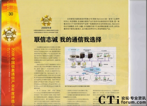 CTI論壇(ctiforum)11月24日消息(記者 張塵):日前,在中國計算機報社開展了2009年度中國信息通信產(chǎn)業(yè)年度獎項評選活動,北京聯(lián)信志誠信息技術(shù)有限公司(簡稱“MyComm公司”)憑借領(lǐng)先的IP語音通信技術(shù)優(yōu)勢,以其長久以來業(yè)界口碑和今年所取得優(yōu)秀業(yè)績,榮獲2009年度中國信息通信呼叫中心領(lǐng)域領(lǐng)軍企業(yè)獎和2009年度中國信息通信IP呼叫中心優(yōu)秀創(chuàng)新產(chǎn)品獎。