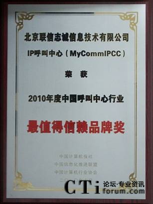 CTI論壇(ctiforum)11月1日消息(記者 潘婷婷):近日,在國(guó)家信息化專家咨詢委員會(huì)的指導(dǎo)下,作為中國(guó)信息化發(fā)展重要推動(dòng)力量的中國(guó)計(jì)算機(jī)報(bào)社、中國(guó)計(jì)算機(jī)行業(yè)協(xié)會(huì)、中國(guó)信息化推進(jìn)聯(lián)盟等國(guó)家級(jí)權(quán)威媒體及國(guó)家信息化領(lǐng)域一級(jí)權(quán)威機(jī)構(gòu),共同組織開展“2010中國(guó)行業(yè)信息化讀者選擇獎(jiǎng)評(píng)選”,重點(diǎn)展示信息化在行業(yè)應(yīng)用中的優(yōu)秀應(yīng)用案例、產(chǎn)品及解決方案。由中國(guó)計(jì)算機(jī)報(bào)社組織業(yè)內(nèi)專家,在經(jīng)過歷時(shí)3個(gè)月的產(chǎn)品征集、方案論證、專家評(píng)審后,北京聯(lián)信志誠(chéng)信息技術(shù)有限公司(簡(jiǎn)稱MyComm公司),其核心產(chǎn)品MyCommIPCC獨(dú)占2010年中國(guó)呼叫中心行業(yè)最值得信賴品牌獎(jiǎng)。