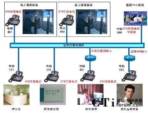 對于隔離病房的觀察,目前的實(shí)現(xiàn)可以使用遠(yuǎn)程視頻監(jiān)控,或者使用電腦方式來遠(yuǎn)程視頻交流。視頻監(jiān)控缺點(diǎn)無法實(shí)時與病人交流,使用電腦交流則操作比較繁瑣。CTS提出使用可視電話的方案來彌補(bǔ)當(dāng)前的缺點(diǎn):實(shí)時與病人交流,可視電話使用操作簡單。