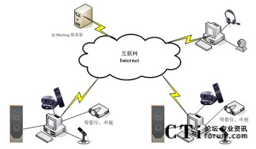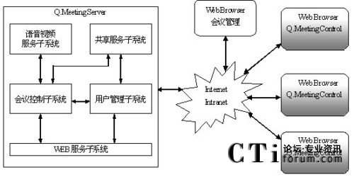系統(tǒng)選用北京億方連線通訊技術(shù)有限公司具有國際先進(jìn)水平的全新第四代網(wǎng)絡(luò)視頻協(xié)作會議中心Q.Meeting為核心進(jìn)行構(gòu)建,該系統(tǒng)由會議服務(wù)器Q.Meeting Server和基于IE 瀏覽器的客戶端組成。Q.Meeting Server運行于一臺服務(wù)器上,構(gòu)成網(wǎng)絡(luò)會議中心,提供會議控制、視頻服務(wù)、語音服務(wù)、共享服務(wù)、WEB服務(wù)和會議用戶管理等功能。所有參加會議的人員只需通過IE瀏覽器訪問會議中心網(wǎng)站就可以參加會議,通過訪問會議頁面和嵌于其中的客戶端插件Q.Meeting Control實現(xiàn)音頻和數(shù)據(jù)共享等交流。