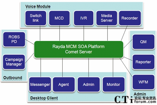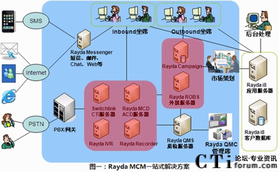 Rayda MCM多渠道呼叫管理平臺(tái),是呼叫中心基礎(chǔ)呼叫業(yè)務(wù)的信息化支撐平臺(tái)系統(tǒng)。Rayda MCM以先進(jìn)的呼叫信息交互為核心,涵蓋呼叫中心系統(tǒng)所必須的ACD、IVR、PD、錄音、質(zhì)檢等基本功能,更整合了統(tǒng)一通信、電話營(yíng)銷等多項(xiàng)企業(yè)迫切需要的功能。MCM支持支持從板卡、傳統(tǒng)PBX到IPPBX網(wǎng)絡(luò)等各種接入方式的建設(shè),支持從單點(diǎn)到分布式等各種組網(wǎng)方式,適應(yīng)從中小企業(yè)到外包型等各種規(guī)模呼叫中心的需求。