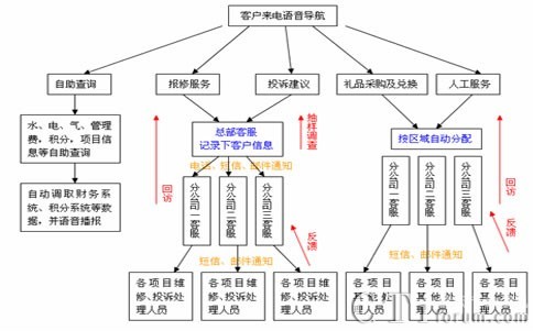 如上圖所示,客戶通過(guò)手機(jī)、電話、傳真機(jī)、IP話機(jī)等撥入XX物業(yè)全國(guó)統(tǒng)一服務(wù)熱線后,可根據(jù)系統(tǒng)語(yǔ)音導(dǎo)航選擇自助查詢、報(bào)修服務(wù)、投訴建議、禮品采購(gòu)及兌換、人工服務(wù)等業(yè)務(wù)?蛻魣(bào)修或投訴統(tǒng)一由總部受理,再轉(zhuǎn)給各分公司所屬項(xiàng)目處理;客戶選擇采購(gòu)及人工服務(wù),系統(tǒng)將根據(jù)客戶來(lái)電歸屬地將其就近接入當(dāng)?shù)匚飿I(yè)公司客服座席處理,如電話長(zhǎng)時(shí)間未被接聽,則系統(tǒng)會(huì)自動(dòng)把電話再轉(zhuǎn)到總部受理?偛繉⒍〞r(shí)采集各分部座席錄音、通話記錄等相關(guān)管理數(shù)據(jù)。