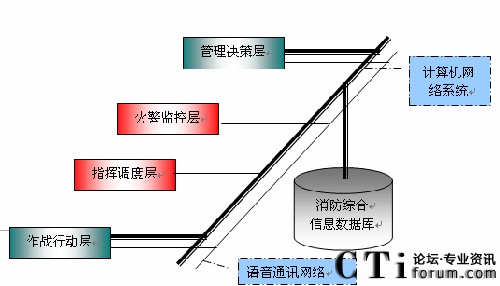 通過對消防安全監(jiān)控指揮中心業(yè)務(wù)的分析,引進(jìn)先進(jìn)的數(shù)據(jù)通信網(wǎng)絡(luò)和語音通訊網(wǎng)絡(luò),我們可以將未來的消防業(yè)務(wù)層次抽象地概括為四層(如圖所示):管理決策層、火警監(jiān)測層、指揮調(diào)度層和作戰(zhàn)行動層。與管理決策層對應(yīng)的組織機構(gòu)為消防通信指揮中心;與火警檢測層、指揮調(diào)度層對應(yīng)包括消防指揮中心的接處警子系統(tǒng)、指揮調(diào)度等子系統(tǒng);與作戰(zhàn)行動層對應(yīng)的組織機構(gòu)為消防站(消防隊)和消防車及消防隊員。
