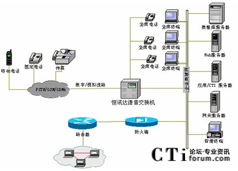 系統(tǒng)采用的硬件根據(jù)實(shí)際需求配置,如果實(shí)際接入電話容量小于30條線,系統(tǒng)與市話要采用普通模擬中繼線接入, 可選擇配置恒訊達(dá)公司HXD09的模擬板(AT0),申請(qǐng)的普通模擬中繼線需開通來(lái)電顯示業(yè)務(wù),如電信部門不開通項(xiàng)服務(wù),采用此種接入方式無(wú)法實(shí)現(xiàn)來(lái)電顯示功能;根據(jù)接入容量和話務(wù)員數(shù)量的總和計(jì)算卡的應(yīng)用數(shù)量,如實(shí)際接入電話容量大于等于30條線,則可采用E1接口數(shù)字中繼線接入,