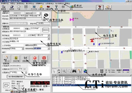 - 接警功能: 系統配備多部受理電話,同時可以受理多個報警電話。 報警電話進入時,值班電話同時振鈴,任意電話提機接通,每次報警過程形成記錄存放在電腦中警情自動分流