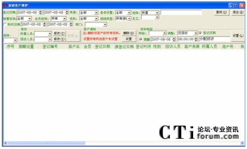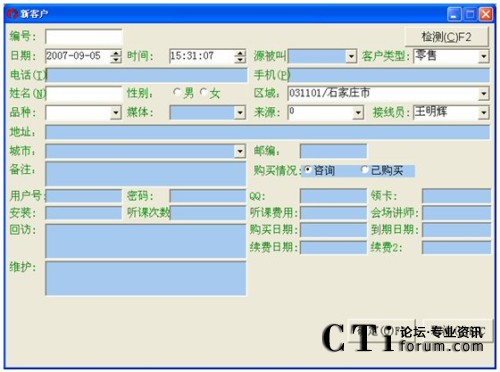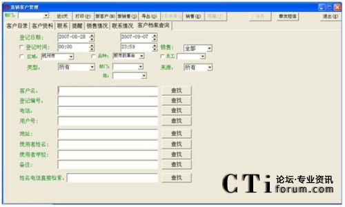 注:對(duì)于登記日期一直到客戶名這一段條件的查詢(即上圖中所有的那些查詢條件),都得點(diǎn)擊客戶名欄對(duì)應(yīng)的那個(gè)查找按鈕才能進(jìn)行有效的查找,否則若點(diǎn)擊其它按鈕(姓名電話直接檢索對(duì)應(yīng)的查找除外),都會(huì)提示“請(qǐng)輸入****”這種錯(cuò)誤信息。而點(diǎn)擊最后一個(gè)查找,也是無(wú)效的,會(huì)轉(zhuǎn)到客戶管理中空白信息欄(即什么也查不到)。