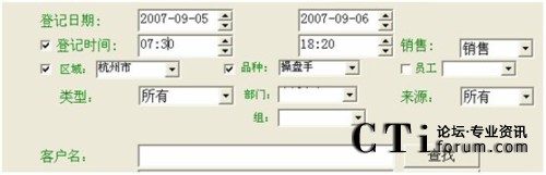 例子:查找2007年9月5日到2007年9月6日間,登記時(shí)間為早上7:30到晚上18:20,購(gòu)買了操盤手軟件的杭州市顧客的查找設(shè)置如下: