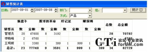 統(tǒng)計(jì)方式中含5種查詢方式:時(shí)間段、員工、產(chǎn)品、銷售、區(qū)域,可按這幾種方式進(jìn)行進(jìn)線銷售統(tǒng)計(jì)。