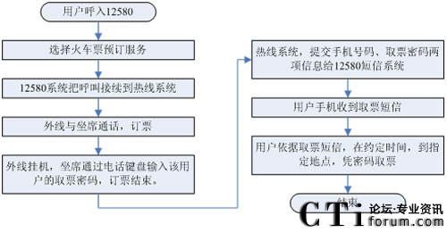 1、用戶通過手機(jī)電話訂票,首先進(jìn)入12580系統(tǒng),在12580系統(tǒng)中選擇訂票服務(wù),12580系統(tǒng)通過與訂票熱線的語(yǔ)音線路,把用戶接續(xù)到訂票熱線系統(tǒng)。