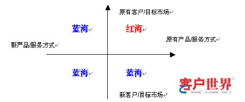我們知道,排除競爭因素,在構(gòu)成市場的主體中,幾個要素是非常重要的:廠商、客戶、產(chǎn)品(服務(wù))。當若干個廠商的產(chǎn)品(服務(wù))相近,定位的客戶群體(或市場細分)相同或相似,則自然會形成紅海態(tài)勢的競爭,廠商的產(chǎn)品及服務(wù)無法形成差異。去除廠商這個要素,可以看到,影響到定位很重要的要素即:產(chǎn)品(服務(wù))方式及客戶定位,聯(lián)系到對市場的“藍海”和“紅!钡膭澐,我們可以通過下圖展現(xiàn)客戶(或目標市場)、產(chǎn)品(服務(wù))與紅海、藍海的對應(yīng):