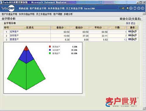 根據(jù)預(yù)先設(shè)定的客戶價值評估模型,CRM會自動計算出每個客戶的價值得分以及對應(yīng)到不同等級的客戶價值,并會記錄到客戶項(xiàng)下,便于業(yè)務(wù)人員在與客戶接觸時,直觀了解客戶價值情況?蛻魞r值金字塔分析(如圖),可以動態(tài)的了解各類客戶的價值分布。