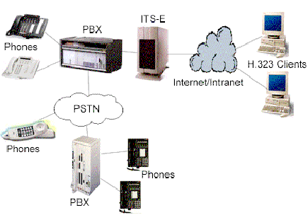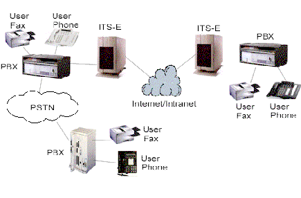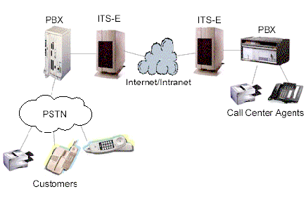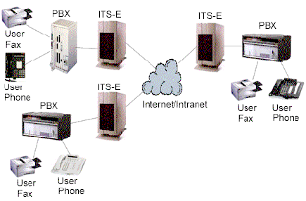 許多公司有多個(gè)辦公地點(diǎn),各地之間有著頻繁的通訊往來,電話和傳真。典型地,通訊涉及到公用交換電話網(wǎng)(PSTN)或PBX間的私人連接路線。Internet電話服務(wù)器(ITS-E)提供了另一選擇;驹硎且惶幱脩魮艽虻碾娫捊(jīng)本地PBX路由到本地ITS-E,本地ITS-E通過IP網(wǎng)絡(luò)送到目的地ITS-E,目的地ITS-E再將電話送到目的地PBX上,最后送到目的地電話或傳真機(jī)上。