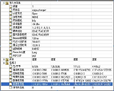 主要測試指標(biāo)有:信號強(qiáng)度,噪聲,信噪比,載干比,支持速率,MAC地址,認(rèn)證及加密方式,Beacon幀間隔,Preamble長度類型,PCF/DCF,SSID,占用信道等。