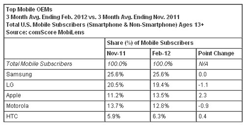 按截至今年2月份的三個月的平均數(shù)計算,美國13歲以上的手機用戶數(shù)為2.34億。三星名列手機原始設備制造商之首,占有美國手機市場25.6%的份額;LG電子名列第二,占有19.4%的市場份額;蘋果排名第三,占有13.5%的市場份額(上升2.3個百分點);摩托羅拉排名第四,占有12.8的市場份額;HTC排名上升至第五,占有6.3%的市場份額(上升0.4個百分點)。