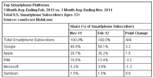 按截至今年2月份的三個月的平均數(shù)計算,美國智能手機用戶數(shù)超過1.04億人,相比截止去年11月的三個月的平均數(shù)增長14%。谷歌Android操作系統(tǒng)在美國手機市場的份額超過50%,相比去年同期上升了17個百分點;蘋果iOS操作系統(tǒng)排名第二,其市場份額為30.2%(與去年同期相比上升了5個百分點);其后依次是RIM黑莓操作系統(tǒng)的13.4%,微軟Windows