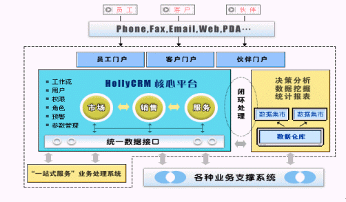 HollyCRM通過EAI與企業(yè)原有的業(yè)務系統(tǒng)充分整合,有效解決了阻礙企業(yè)內(nèi)部信息良性流轉(zhuǎn)的"信息孤島"現(xiàn)象。HollyCRM將分析型CRM產(chǎn)生的客戶價值和經(jīng)營分析結(jié)果實時反饋到運營型CRM中,通過協(xié)作型CRM提供的接觸渠道,針對不同客戶提供個性化的營銷、銷售和服務活動。HollyCRM實現(xiàn)了整個企業(yè)信息的閉環(huán)、良性循環(huán)。