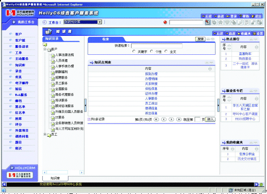 | 業(yè)務咨詢:快速查詢知識點,定位相關業(yè)務信息解答客戶。支持“關鍵字”、“個性化編碼”、“全文檢索”、“熱點排行”、“個人收藏夾”等多種信息查詢方式。 |
