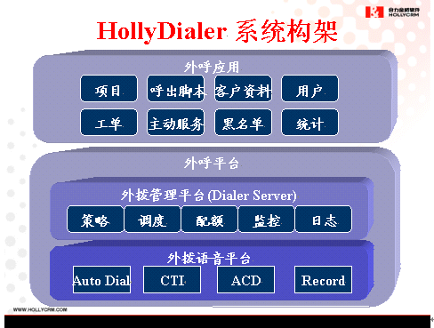 HollyDialer是HOLLYCRM(合力金橋軟件)公司自主開發(fā)的外撥業(yè)務綜合平臺,作為HollyC6呼叫中心系統(tǒng)的增值軟件,HollyDialer主要圍繞客戶實現(xiàn)相關的主動服務,完成市場調查、客戶回訪、電話營銷等多種類型的外撥任務。外撥設備支持多種主流交換平臺的無縫集成,能夠靈活定制自動、人工外撥策略,實現(xiàn)預覽式、預測式、多種智能外撥模式,為企業(yè)建設盈利型的呼叫中心提供了最為便捷的工具,