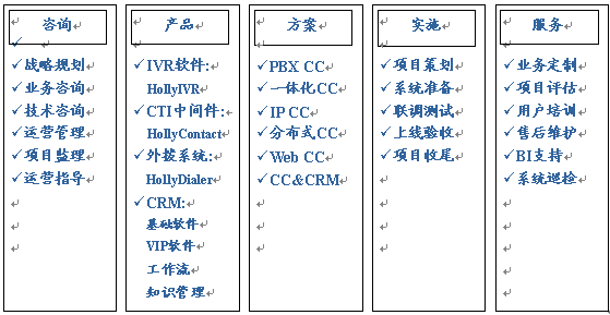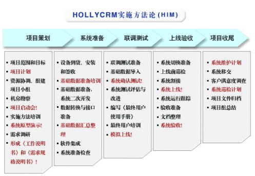 HOLLYCRM(合力金橋軟件)公司是國內最早從事呼叫中心應用軟件開發(fā)與服務公司,在多年的實踐經(jīng)驗基礎上形成了完整的“456”呼叫中心“項目實施方法論”(HIM:HOLLYCRM Implementary Methodology),即“四大實施策略、五個項目階段、六大管理專題”。該體系的有效運行對公司項目的成功上線和推進軟件產(chǎn)品的成熟將起到至關重要的作用。