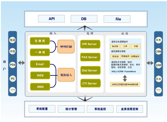 HollyC&C不僅支持電話、傳真、短信、Email、Web多媒體溝通渠道的統(tǒng)一接入和管理,還具有強大的業(yè)務整合接口,能夠幫助企業(yè)實現(xiàn)呼叫中心與企業(yè)其它信息系統(tǒng):如辦公OA、ERP、SCM、財務等系統(tǒng)的接口和工作流程整合。