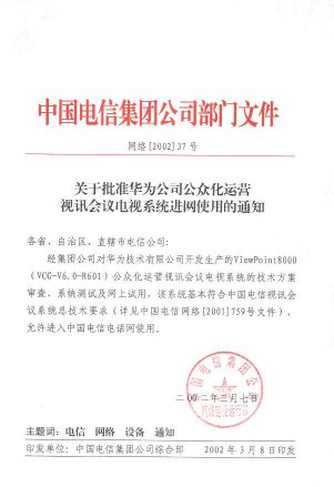 日前,在中國電信集團(tuán)公司組織的“新視通”公眾化視訊運(yùn)營許可證的測試中,華為公司具有完全自主知識產(chǎn)權(quán)的“視點通”ViewPoint 8000綜合視訊系統(tǒng)以其先進(jìn)的設(shè)計理念和卓越的產(chǎn)品性能,順利通過測試,成為業(yè)界第一個獲得中國電信集團(tuán)公司公眾視訊運(yùn)營許可證的產(chǎn)品。同時華為公司也成為目前業(yè)界唯一獲此認(rèn)證的設(shè)備供應(yīng)商。