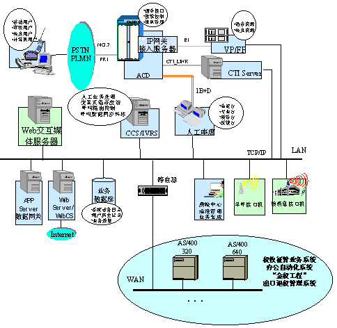 在深圳國稅局方案中,整個(gè)系統(tǒng)的建設(shè)按三期規(guī)劃進(jìn)行。第一期的目標(biāo)主要是搭建呼叫中心平臺(tái),包括ACD(排隊(duì)機(jī))、IVR(交互式語音應(yīng)答系統(tǒng))、CCS(華為呼叫中心中間件)等軟硬件設(shè)備。ACD作為整個(gè)系統(tǒng)的核心接入設(shè)備,采用了華為公司的C&C08-Q排隊(duì)機(jī)。C&C08-Q是大容量高可靠性的數(shù)字排隊(duì)機(jī),通過中國七號(hào)信令或ISDN